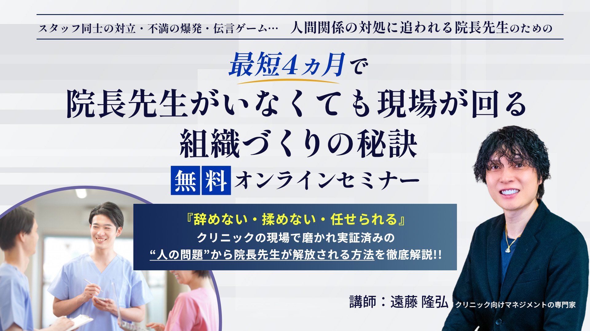 だからこそ、もしあなたが少しでも「自分がいなくても回るクリニックを作り、診療と理念実現に集中したい」と思ってくれたのなら、ぜひオンラインセミナーにご参加ください。